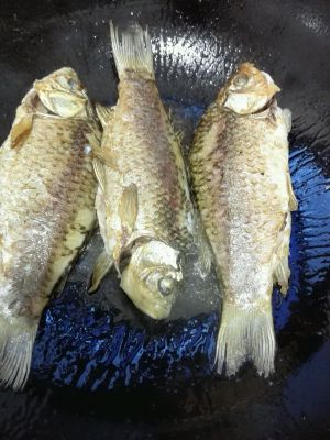 掺入高汤(鲜开水也行),烧开,下烙好的鲫鱼,喷点料酒,滴入2ml醋,中小火煮15分钟