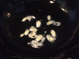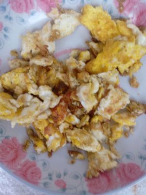 锅里倒油,先把鸡蛋煎熟,然后用锅铲扎成一小块一小块的,我喜欢鸡蛋煎老点,微微带焦,香!