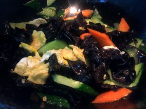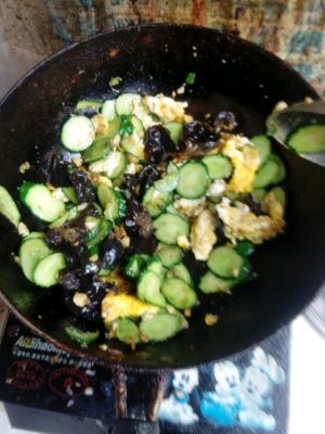 木耳,黄瓜炒熟之后放入炒好的鸡蛋,放点味精还有鸡精调味