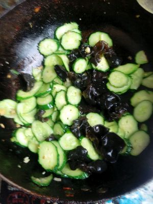 放入适量的油,油开后,放入葱姜蒜,。然后放入黄瓜,木耳,加盐一起炒,