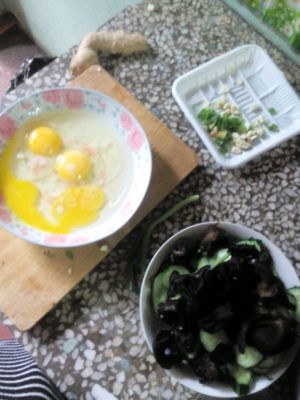 准备食材,并且黄瓜切成片,木耳撕开,然后鸡蛋打好放入盘中,放入少量的淀粉,葱姜蒜切好,