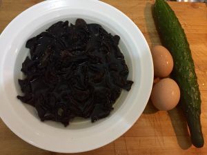 黄瓜切片,木耳泡发,撕成小块,鸡蛋打散,准备