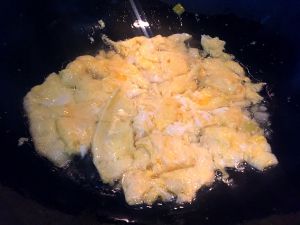 锅中热油,油热加入打散的鸡蛋,待鸡蛋成型立马打碎,盛出备用