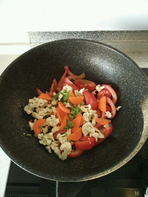 上锅热油,杂蔬全倒入锅中翻炒,油少的话可以淋一点水。