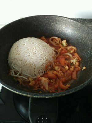 鱿鱼圈和蟹腿肉比较好熟,翻炒几下就可以放面条了,如果锅中汁比较干适量加点水,继续翻炒到收汁。
