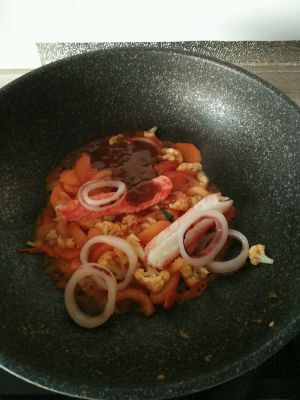 调汁:一大勺甜面酱,一大勺豆瓣酱,一勺鲍鱼汁,三勺料酒调成汁。鱿鱼圈用煮面条的水烫一下,蔬菜切片,菜花切块。