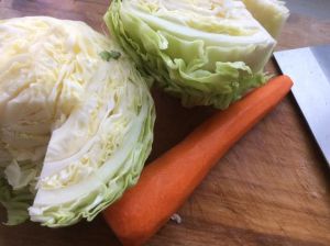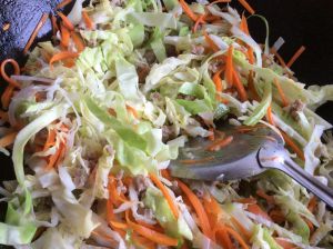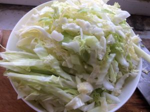 倒入圆白菜和炒面,加生抽,老抽,胡椒粉,开水,盐盖上盖子3—5分钟后翻炒。