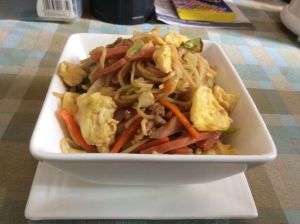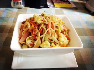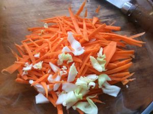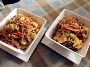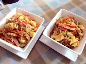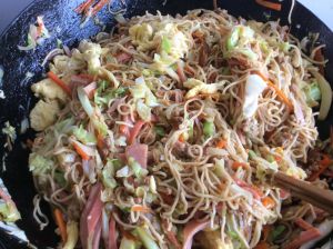 炒面半斤。(卖面条的店里有蒸熟的面条如果没卖蒸好的面,自己就买生的细面条,蒸锅铺好蒸布把抖松散的面条放入上汽蒸20分钟左右。蒸熟后淋少许食用油继续抖散面条。)