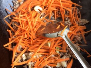 底油,放入大料炸香放葱花,西红柿炒软(可以加一勺番茄酱),在放胡萝卜和洋葱丝炒软。