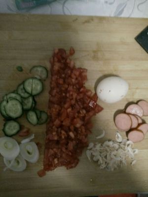 西红柿一个,鸡蛋一个,黄瓜一段,火腿一段,虾皮适量,葱花一段,