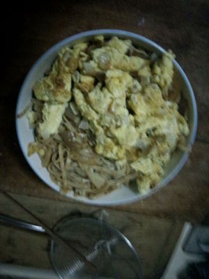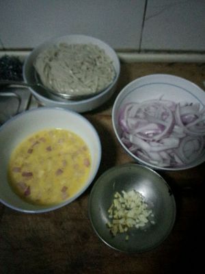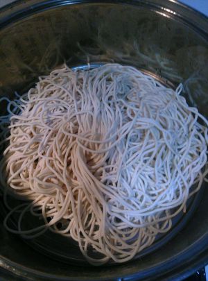 少许洋葱 葱切碎 拌入鸡蛋 少许盐搅匀 龙须面(家里没了凑合下)过水煮熟 碗里放些冷水
