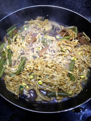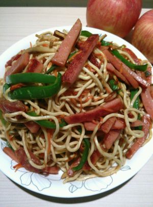 配料翻炒片刻倒入蒸好的面条,然后放入盐、糖、淡酱油、蚝油。面条上了色就可以装盘了。