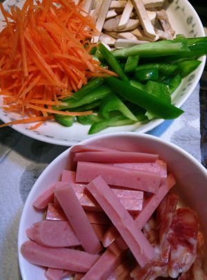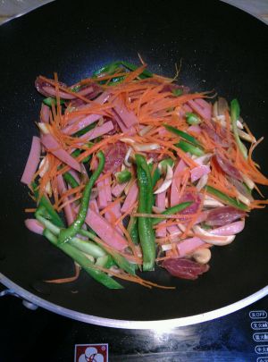 大火锅热下油,先放入白蘑茹和广式腊肠,翻炒至腊肠变色后依次放入火腿肠、胡萝卜丝、青椒丝。
