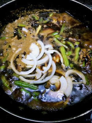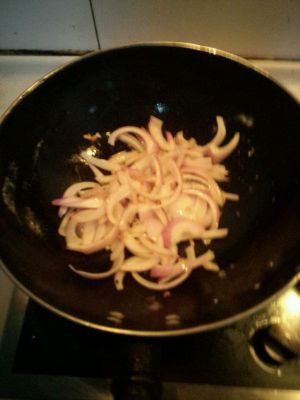 鸡蛋清炒 放碗里备用 放油 油热 放入碎姜蒜 后放入洋葱 大火翻炒 后放盐 酱油 南德 适量 熟以后点入少许 蒸鱼豉油 醋 香油