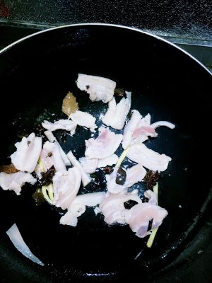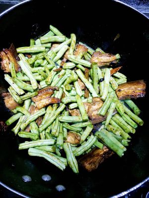 热锅下油,放泡好的笋脯大火翻炒几下,陆续放盐、酱油、沙茶酱,炒匀,转小火;