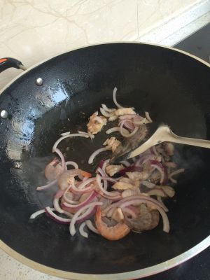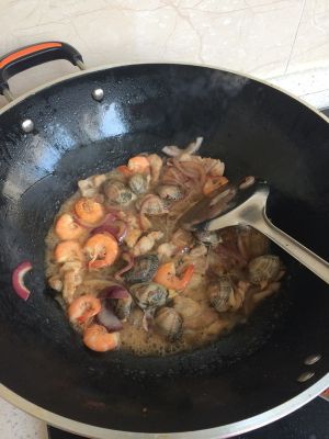 按照肉,洋葱,虾,花蛤的顺序依次放入锅中炒,每放入一样就炒一会儿