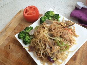 炒锅放油加热。放入青椒丝、火腿丝和四季豆丝炒出香味,再加入郫县豆瓣翻炒。再把拉面放进去搅拌均匀放入盐、鸡精、葱花出锅