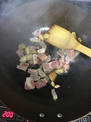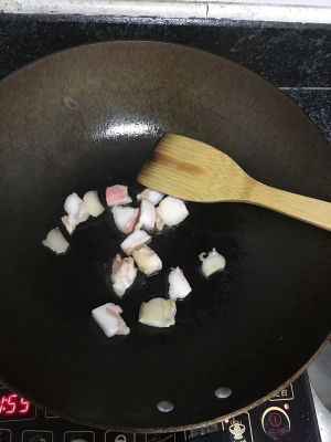 热锅凉油,放入肥肉,中火炒至油渗出来肉略焦。因为肥肉会渗油,所以前期少放点油。