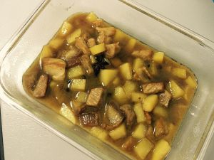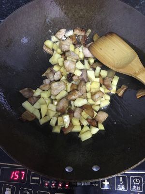 锅内加油,油热后加蒜和姜爆香,加入肉片翻炒,酱油和料酒一同加入,肉炒变色后加入土豆翻炒
