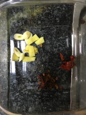生姜大蒜干辣椒切碎准备好,八角花椒准备好。