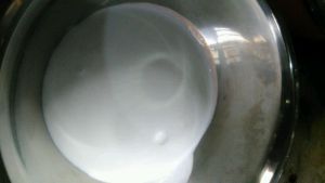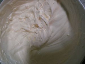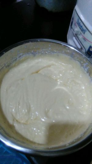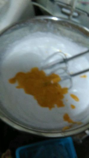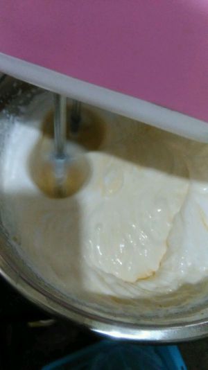 淡奶油加剩下的20g白砂糖打发,不要打过,稍稍起点纹路即可,然后加入冷却后的蛋液中搅匀。