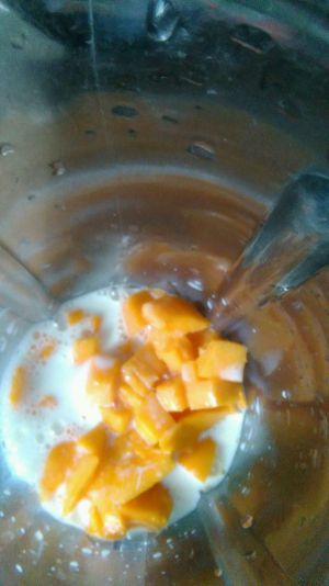 牛奶加入搅碎的芒果泥搅拌均匀