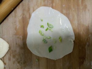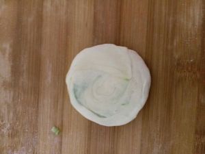 取三分之一面团。擀成长条状,均匀地抹上油酥,撒上葱花。