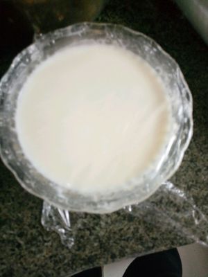 将蛋清和牛奶混合,加入糖,搅拌,去除泡沫,小心倒入原容器,使奶皮浮在上当