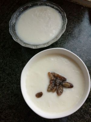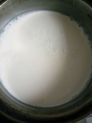 250ml纯牛奶加一勺白糖放入小奶锅中加热后放凉。