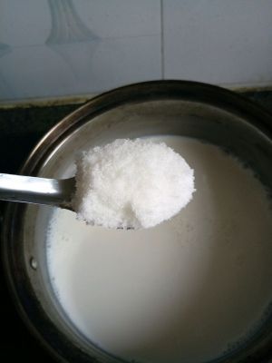 加入白砂糖 (依照个人口味)放糖,本人喜欢甜的,所以这么大的勺放了3大勺。开火,煮沸,然后关火放凉,――切记一定要放凉要不蛋清倒入里面就成蛋花汤了!