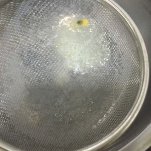 蛋清奶液过筛,筛掉蛋清中尚未打发的部分。如果蛋奶液中有气泡和奶沫用勺子撇去。