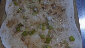 将面团擀开,撒上调料和葱花,卷起来,重复2--3次