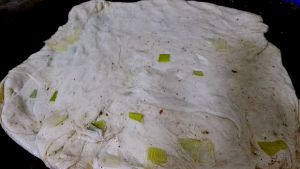 把和好的面杆成薄薄的饼,越薄越好。然后把拌好的葱花抹在饼皮上。