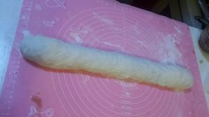 以一头为中心卷好。(为防止擀的时候会粘案板,可以在底部抹一点油)
