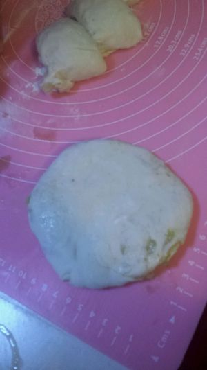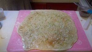 面团擀成大饼,把油盐液刷匀,撒上葱花。
