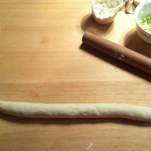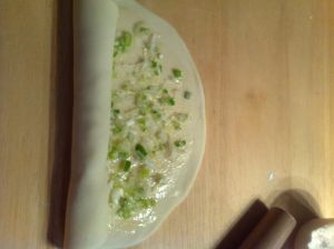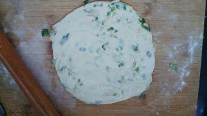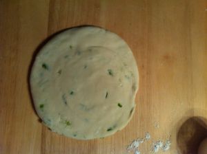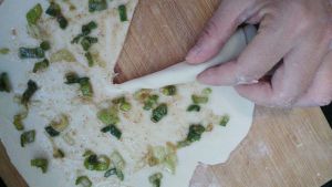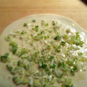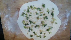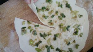面分成小剂子,擀开,抹上葱白油,撒上葱绿