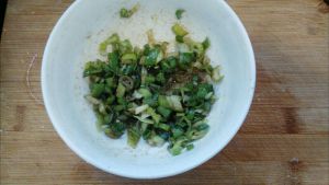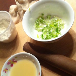 趁着醒面,将葱切碎,加入盐,五香粉或者十三香和植物油(玉米油,葵花籽油,色拉油都可以)混合均匀。