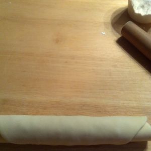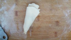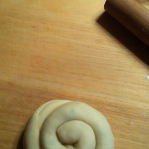从中间开始盘起,这样就会看起来是一圈一圈的效果。将外边那头压到面团下。