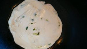 锅中放油,比平时炒菜多一些。油热后把饼皮放锅里,中火煎。