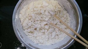 面粉先加入70克热水,用筷子搅成大的面絮状。