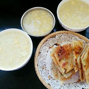 煎好,切块。可以用厨房纸吸一下油。我们的早饭就是油饼加稀饭。