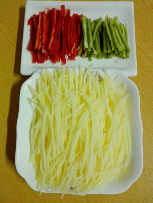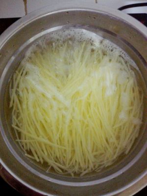 刨好的土豆丝冲洗一遍(主要是去掉它的淀粉),在放在清水里泡15至20分钟,捞起沥干水,煮开水把土豆丝倒入锅內煮开捞起,在泡2分钟凉水。