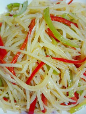 烧热锅倒入油爆香蒜泥,先放青红辣翻炒一下,在倒入土豆丝翻炒2分钟加入盐、鸡精、醋最后淋上水淀粉炒匀即可。