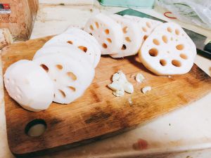 莲藕切片,切厚一点,可以把汤熬的更浓,把蒜头拍碎
