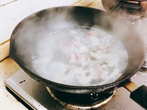 起锅坐水放入排骨,待水开后撇去血沫