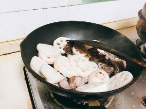 锅中入油,放入蒜头和姜片,放入排骨翻炒到微焦,放入藕片同翻炒