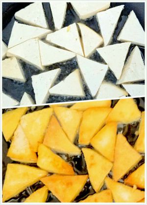 起油锅,油热后放入豆腐,煎到两面金黄盛出备用