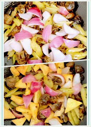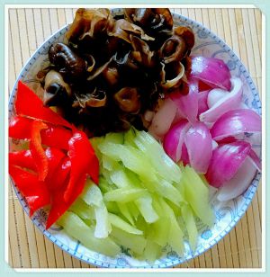 芹菜洗净切斜段,洋葱去老皮洗净切块,红椒去子儿切块,木耳泡好备用