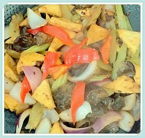 入尖椒,胡萝卜翻炒一分钟。调入胡椒粉,糖,醋,鸡精。