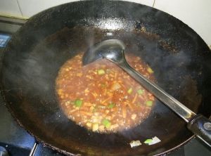 热锅凉油,放肉丁、葱姜蒜小火煸出香味(喜欢吃辣的放干辣椒),再放入蕃茄酱、甜酱、蚝油加少许料酒。